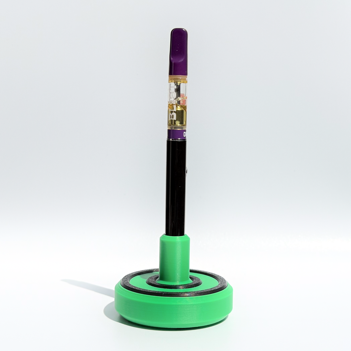 The 510 Vape Stand is a simple way to keep your 510 vape from falling over. Made with rubber grips on the bottom to prevent slippage, internal weight with ball bearings and our snug-fit design prevents your vape from rattling around. You can select any combination of colours (Black, Green, Blue, White, Grey, Red) for the base and the accent rings.
